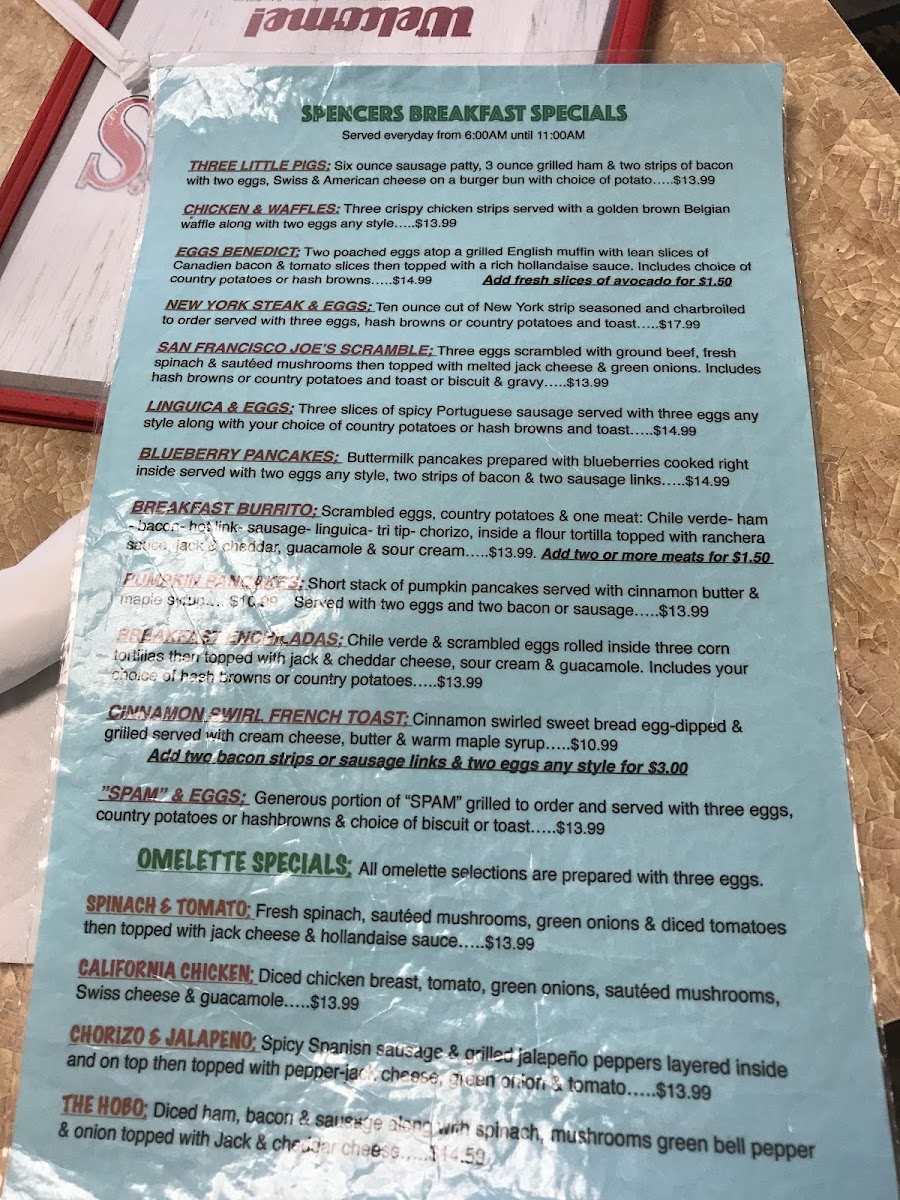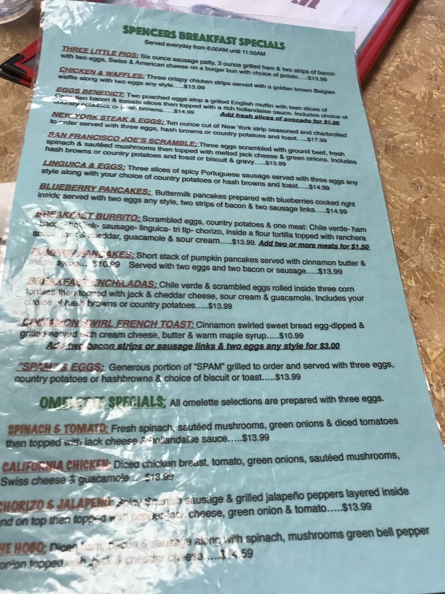 For those adventurous eaters, dive into some of Spencer's Specialties. Their hearty Lumberjack Biscuit Breakfast, as well as the Three Little Pigs and San Francisco Joe's Scramble, offer delightful surprises that invigorate the traditional breakfast concept. Each dish bursts with flavor and is served in generous portions, ensuring an enjoyable meal every time.